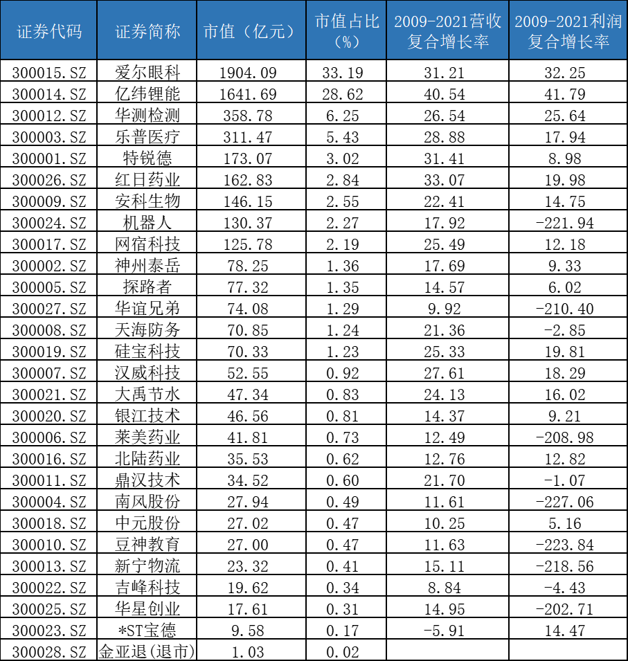 創(chuàng)業(yè)板首批28家公司在2009年10月底掛牌上市,十余年之后回首再看,其中多家公司已經(jīng)被借殼或者并購重組改名,甚至還有一家公司目前處于*ST狀態(tài),還有一家已經(jīng)退市(金亞退),但是也不乏諸如愛爾眼科和億緯鋰能等如今創(chuàng)業(yè)板指數(shù)的權(quán)重股: