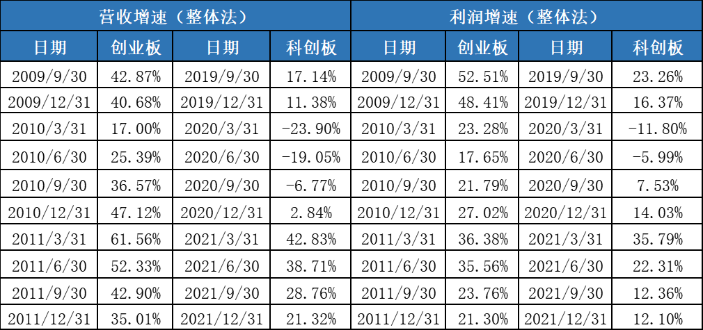 從整體上看,科創(chuàng)板前三年的表現(xiàn)與創(chuàng)業(yè)板前三年表現(xiàn)相當(dāng),創(chuàng)業(yè)板指數(shù)前三年接近腰斬(從1239.6點跌至最低585.44點),而科創(chuàng)50指數(shù)頂部回撤幅度也達到了50.58%(1726點跌到853.21點)。另一方面,從企業(yè)的經(jīng)營成果來看,即使受到疫情影響,科創(chuàng)板的收入利潤增速也與當(dāng)年的創(chuàng)業(yè)板類似,表現(xiàn)出了較高的成長性: