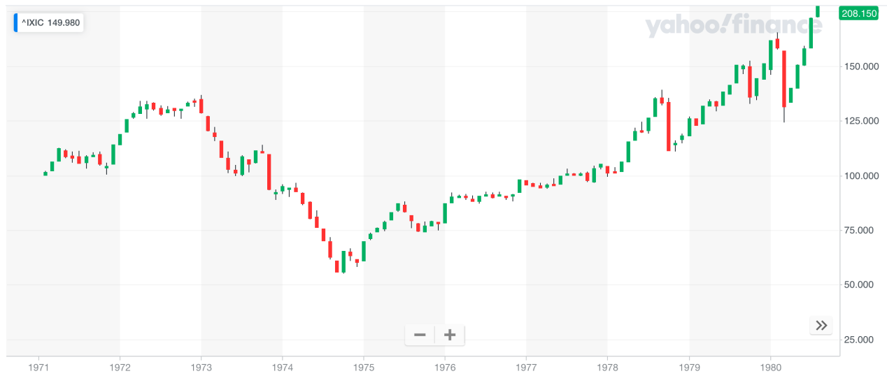 以下是1971-1980年納斯達克指數(shù)走勢: