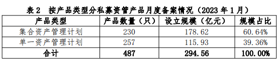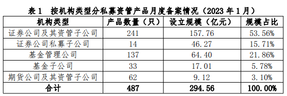 從私募資管產(chǎn)品備案情況來看,2023年1月份,證券期貨經(jīng)營機構(gòu)當月共備案私募資管產(chǎn)品487只,設(shè)立規(guī)模294.56億元。當月新設(shè)產(chǎn)品平均備案核查時間為2.4個工作日。