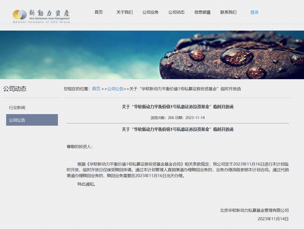 此外,11月14日,華軟新動(dòng)力網(wǎng)站上還發(fā)布了關(guān)于華軟新動(dòng)力平衡價(jià)值1號(hào)私募證券投資基金臨時(shí)開(kāi)放贖回公告和投資經(jīng)理變更的兩則公告。