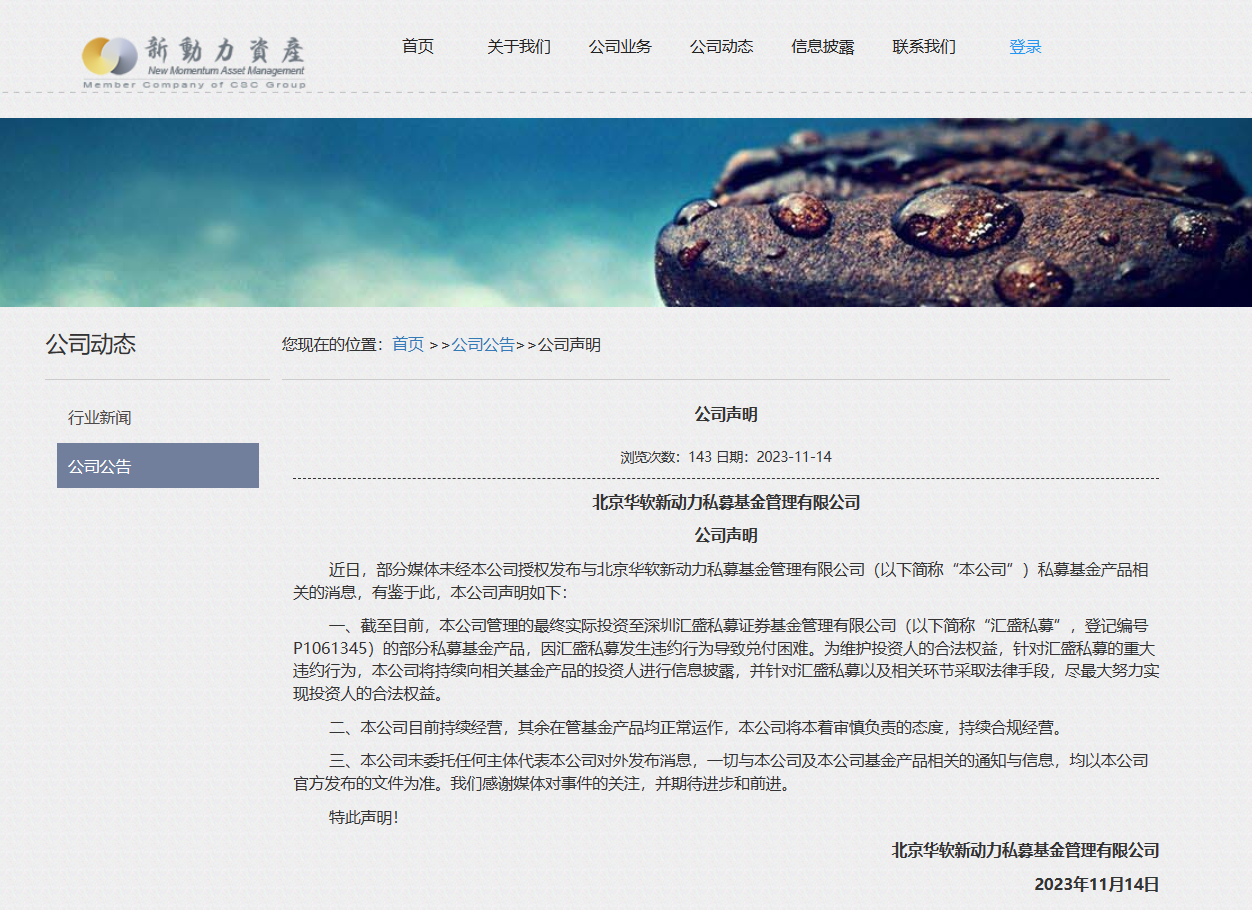 該消息在市場(chǎng)中快速發(fā)酵后,華軟新動(dòng)力于11月14日下午在官網(wǎng)發(fā)布了一則最新公告,公告稱,截至目前,本公司管理的最終實(shí)際投資至匯盛私募的部分私募基金產(chǎn)品,因匯盛私募發(fā)生違約行為導(dǎo)致兌付困難。華軟新動(dòng)力表示,為維護(hù)投資人的合法權(quán)益,針對(duì)匯盛私募的重大違約行為,本公司將持續(xù)向相關(guān)基金產(chǎn)品的投資人進(jìn)行信息披露,并針對(duì)匯盛私募以及相關(guān)環(huán)節(jié)采取法律手段,盡最大努力實(shí)現(xiàn)投資人的合法權(quán)益。