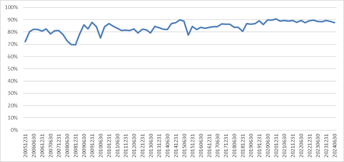 我們統(tǒng)計(jì)全市場(chǎng)主動(dòng)權(quán)益基金的持股倉(cāng)位變動(dòng)情況,可以看到公募基金的持股行為,在過(guò)去20年維持在70%至90%的高倉(cāng)位水平運(yùn)作,是典型的長(zhǎng)期資金行為模式。