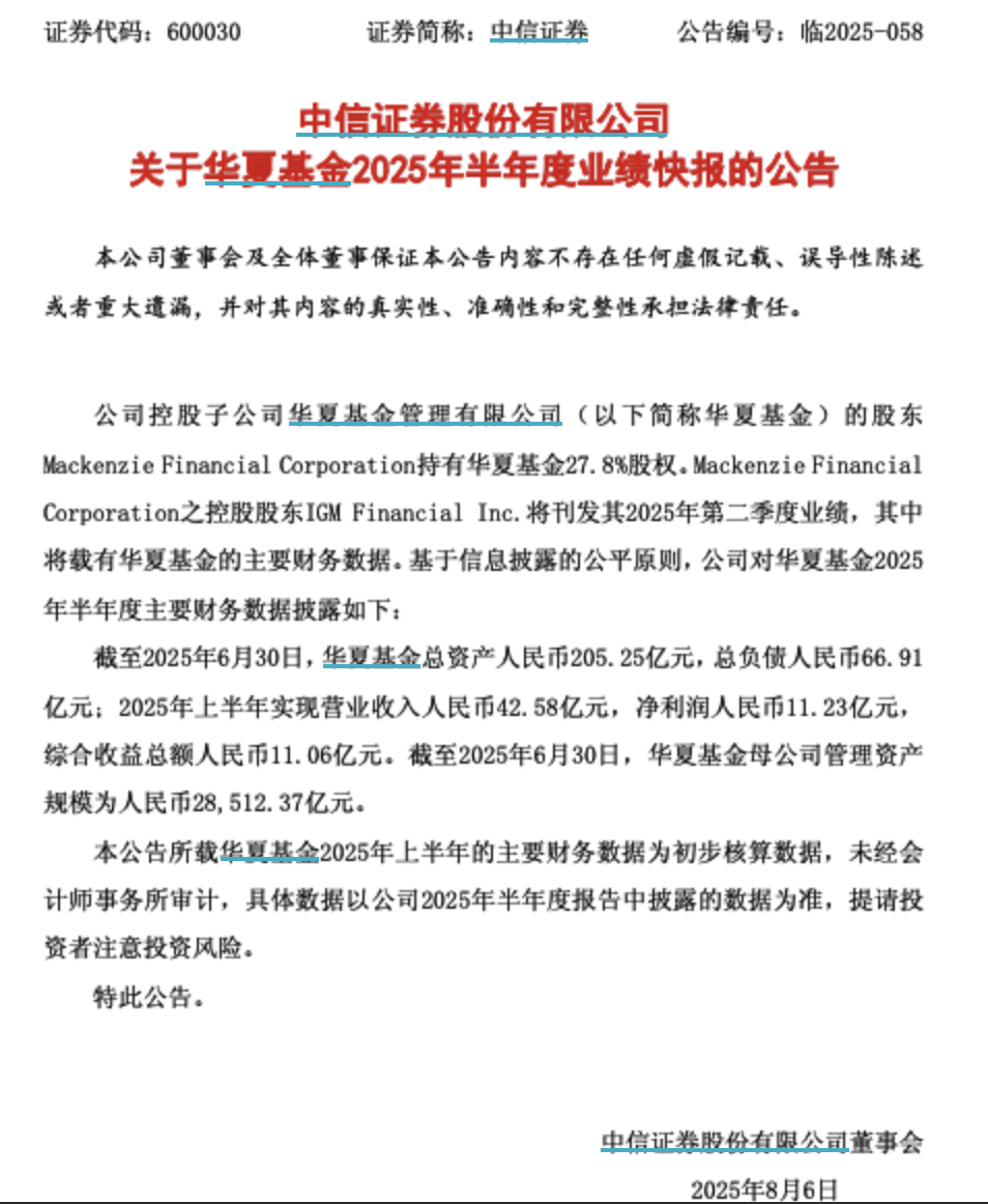 8月6日,中信證券發(fā)布華夏基金2025年半年度業(yè)績快報顯示,截至2025年6月30日,華夏基金總資產人民幣205.25億元,總負債人民幣66.91億元;2025年上半年實現(xiàn)營業(yè)收入人民幣42.58億元,凈利潤人民幣11.23億元,綜合收益總額人民幣11.06億元。截至2025年6月30日,華夏基金母公司管理資產規(guī)模為人民幣2.85萬億元。
