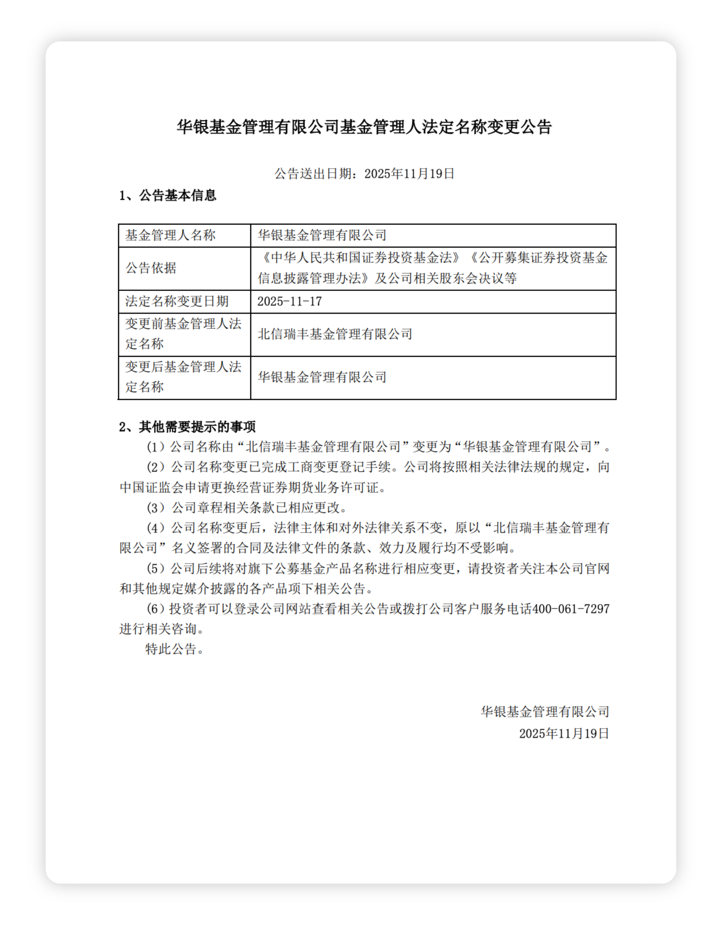 本報(bào)訊 (記者彭衍菘)11月19日,原北信瑞豐基金管理有限公司公告稱,公司名稱變更為“華銀基金管理有限公司”(以下簡(jiǎn)稱“華銀基金”)。