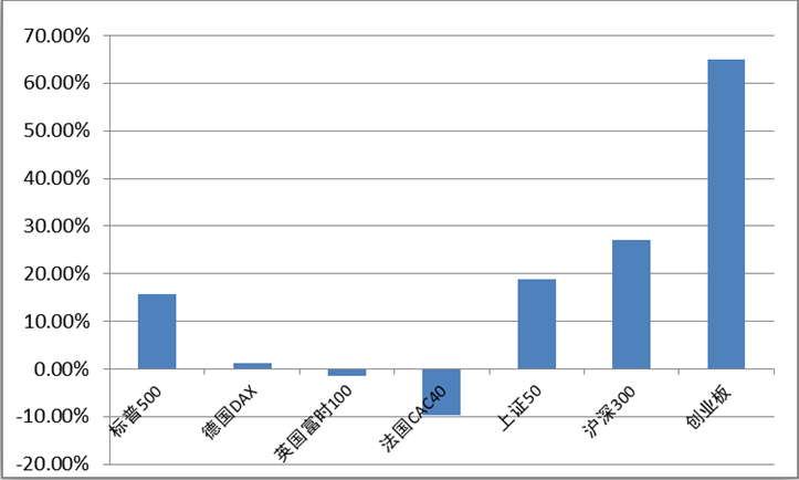2020年的新冠疫情造成了巨大的沖擊,各國央行為應(yīng)對經(jīng)濟(jì)下滑積極釋放流動性,但因?yàn)楦綦x等防疫政策導(dǎo)致的制造業(yè)停滯,大量無處可去的資金流入了資本市場。我們看到,全球股市在一季度大跌之后,均陸續(xù)開啟反彈行情,其中A股依靠更快的基本面復(fù)蘇表現(xiàn)亮眼。全年來看,標(biāo)普500上漲15.62%,德國DAX也累計(jì)微漲1.28%,但同期英國富時100和法國CAC40仍累計(jì)下跌1.54%和9.78%。得益于中國對疫情的成功控制和順利復(fù)工復(fù)產(chǎn)所帶來的基本面優(yōu)勢,上證50、滬深300和創(chuàng)業(yè)板在2020年分別上漲18.85%、27.21%和64.96%,在全球市場中名列前茅。