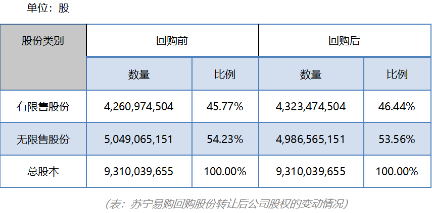 根據(jù)擬定的回購方案,蘇寧易購預計出資不超過10億元從二級市場回購股份,按照回購價格16元計算,約為6250萬股,占公司總股本約0.67%。若回購股份全部用于員工股權(quán)激勵計劃,則回購股份轉(zhuǎn)讓后公司有限售股份比例由45.77%增至46.44%。