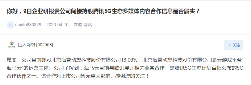 4月30日,巨人網(wǎng)絡(luò)在互動易上回復(fù)投資者關(guān)于是否間接持股騰訊5G生態(tài)合作伙伴海馬云,稱屬實。目前巨人持有北京海譽動想科技股份有限公司(簡稱“北京海譽動想”)18.06%的股份,海馬云是后者旗下產(chǎn)品。