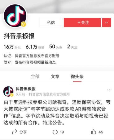 值得注意的是,寶通科技公眾號文章提到了“哈視奇更是與字節(jié)跳動(抖音)達成獨家代理合作,為抖音獨家定制AR游戲,并且有多款游戲正在洽談中。”
