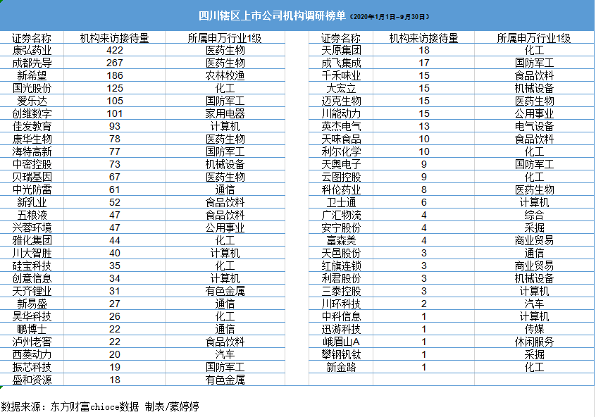 在機(jī)構(gòu)調(diào)研榜單中,6家川股上市公司今年前三季度獲百家以上機(jī)構(gòu)扎堆調(diào)研。其中,康弘藥業(yè)、成都先導(dǎo)、新希望、國(guó)光股份、愛(ài)樂(lè)達(dá)分別以422家、267家、186家、125家、105家的機(jī)構(gòu)調(diào)研數(shù)量,入圍今年前三季度川股最受機(jī)構(gòu)投資者關(guān)注排行榜的前五名。