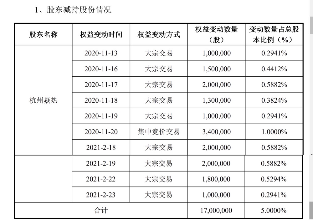 據(jù)悉,杭州焱熱因違約已多次遭被動(dòng)減持。公告顯示,2020年11月13日至2021年2月23日,杭州焱熱因股票質(zhì)押違約被中泰證券通過大宗交易以及集中競價(jià)方式處置冀凱股份累計(jì)達(dá)10次。
