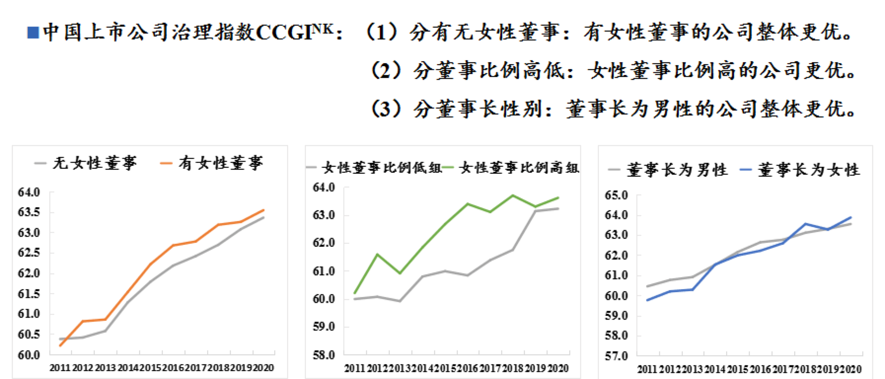 實(shí)際上,據(jù)前述《報(bào)告》,雖然在過(guò)去十年間女性董監(jiān)高的數(shù)量正不斷增加,目前,女性董事參與上市公司戰(zhàn)略決策的程度仍然較低。數(shù)據(jù)顯示,即便有72.77%的上市公司設(shè)置了女性董事,但其中50%以上的女性董事僅是獨(dú)立董事?!秷?bào)告》中提到,有觀點(diǎn)認(rèn)為,多元化可以提高董事會(huì)的決策水平,改善公司與投資者、外部團(tuán)體及顧客的關(guān)系,甚至直接提高公司的績(jī)效等。而從中國(guó)上市公司治理指數(shù)來(lái)看,有女性董事及女性董事比例高的公司整體表現(xiàn)的確更勝一籌。