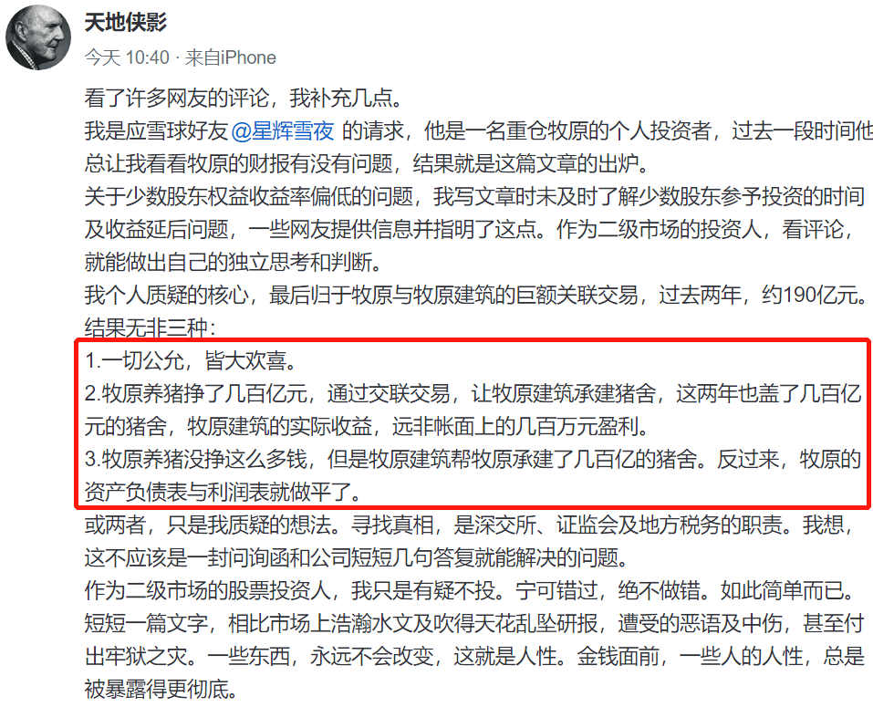 文章發(fā)布后,“天地俠影”繼續(xù)就牧原股份密集發(fā)表了諸多觀點,質(zhì)疑的點主要在于: