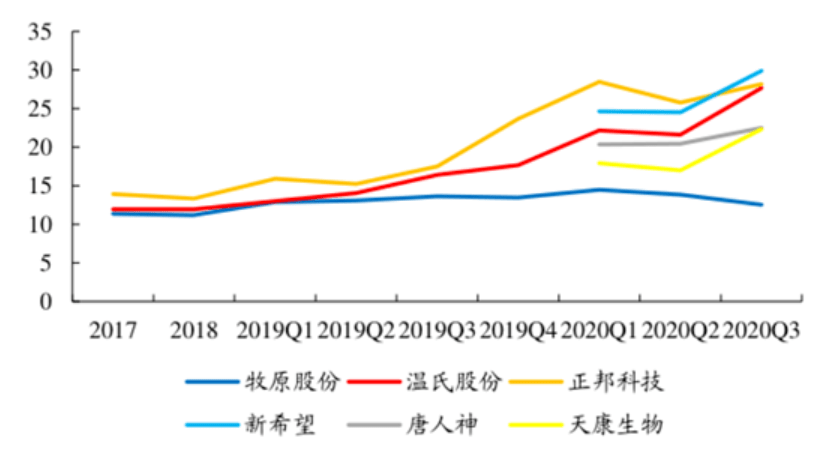 因此,未來以牧原為主的龍頭豬企或?qū)⑼ㄟ^“以量換價”形式,提升行業(yè)集中度。2020Q1-Q3牧原股份、新希望、正邦科技、溫氏股份紛紛加速推進擴張,資本開支大幅增長,分別同比增長441%、374%、250%、203%。