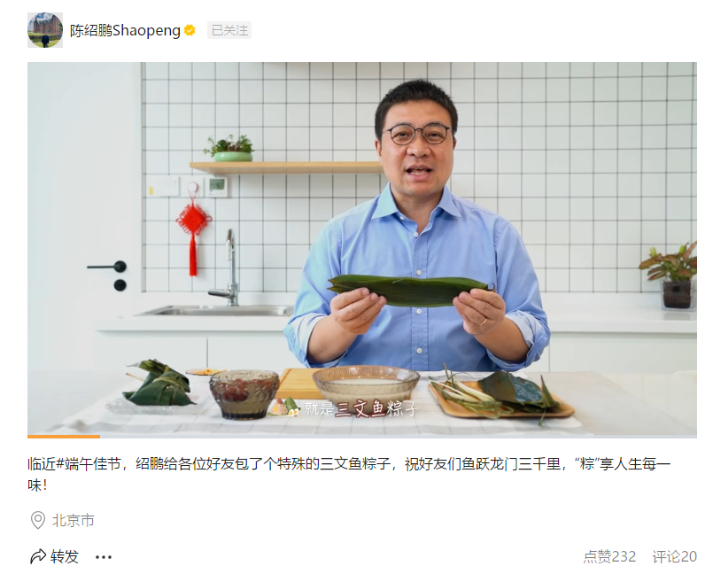 視頻中,陳紹鵬介紹了佳沃股份新推出的三文魚肉松產品,并親自示范如何制作三文魚肉松粽子。陳紹鵬還寄語高考學子:“祝愿高考學子們都能魚躍龍門三千里,‘粽’享人生每一味!”他略帶靦腆的笑稱:“我是一個北方人,我包粽子的手藝沒有那么熟練啊,大家不要笑話我。我也是這么多年第一次包和吃三文魚粽子。”
