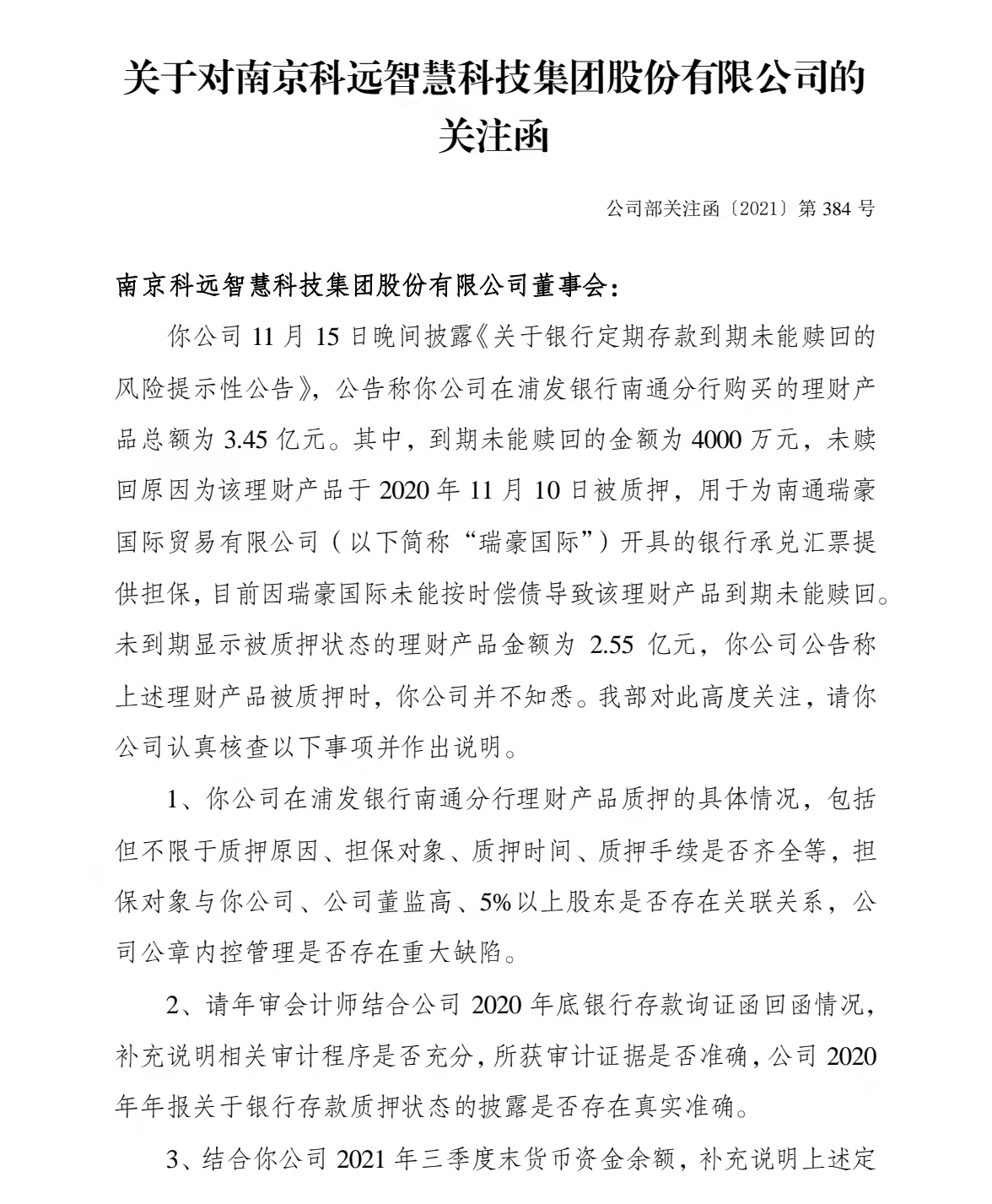 科遠(yuǎn)智慧3億元存款遭質(zhì)押擔(dān)保一事持續(xù)引發(fā)市場(chǎng)關(guān)注,11月17日,深交所向公司下發(fā)關(guān)注函,要求公司認(rèn)真核查并說明在浦發(fā)銀行南通分行理財(cái)產(chǎn)品質(zhì)押的具體情況。