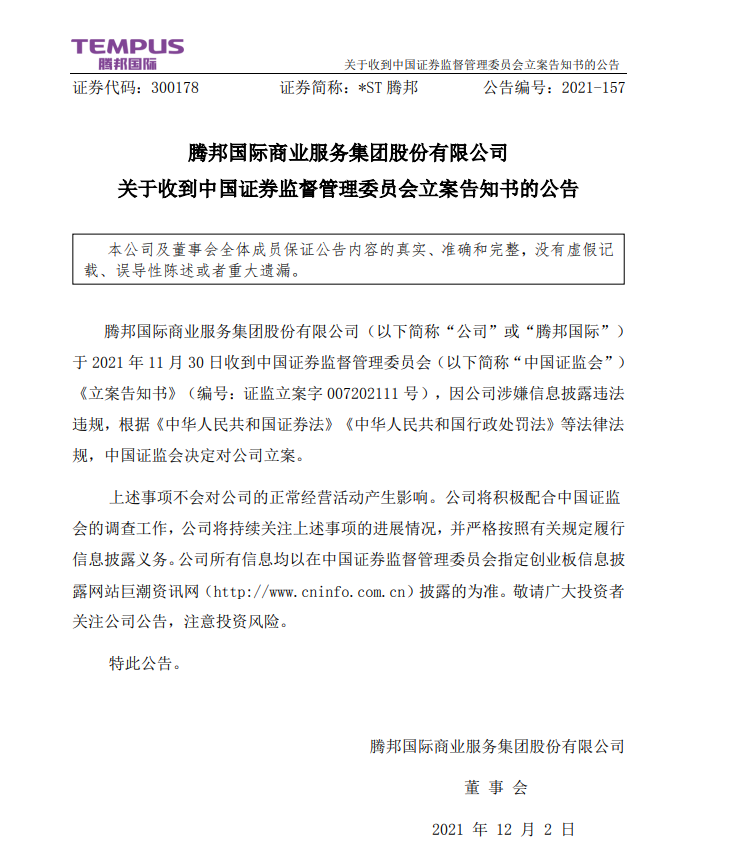 12月2日晚間,*ST騰邦發(fā)布公告稱,公司于11月30日收到中國(guó)證監(jiān)會(huì)《立案告知書》,因涉嫌信息披露違法違規(guī),中國(guó)證監(jiān)會(huì)決定對(duì)公司立案。