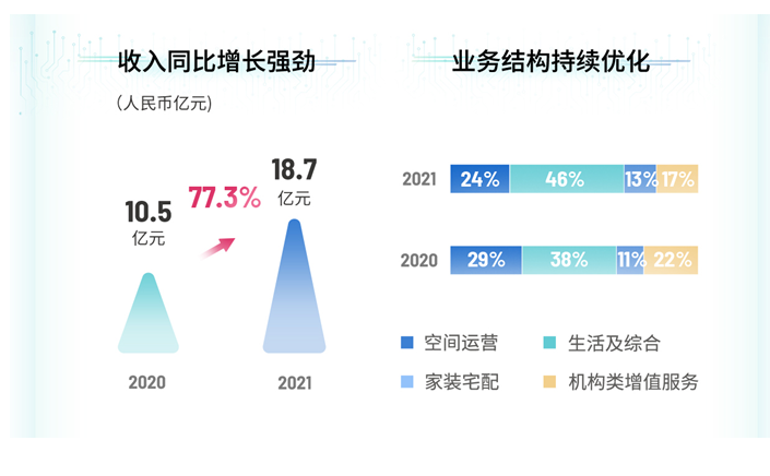 雅生活一直聚焦社區(qū)生活服務(wù),大力發(fā)展市場化業(yè)務(wù),并通過資本驅(qū)動、自營孵化、合作試點、跨界合作等方式,不斷突破業(yè)務(wù)邊界,打造雅生活收入增長第二曲線。年內(nèi),集團業(yè)主增值服務(wù)收入達18.67億元,同比大幅增長77.3%,占總收入約13.2%,相比2020年占比提升了2.7%。