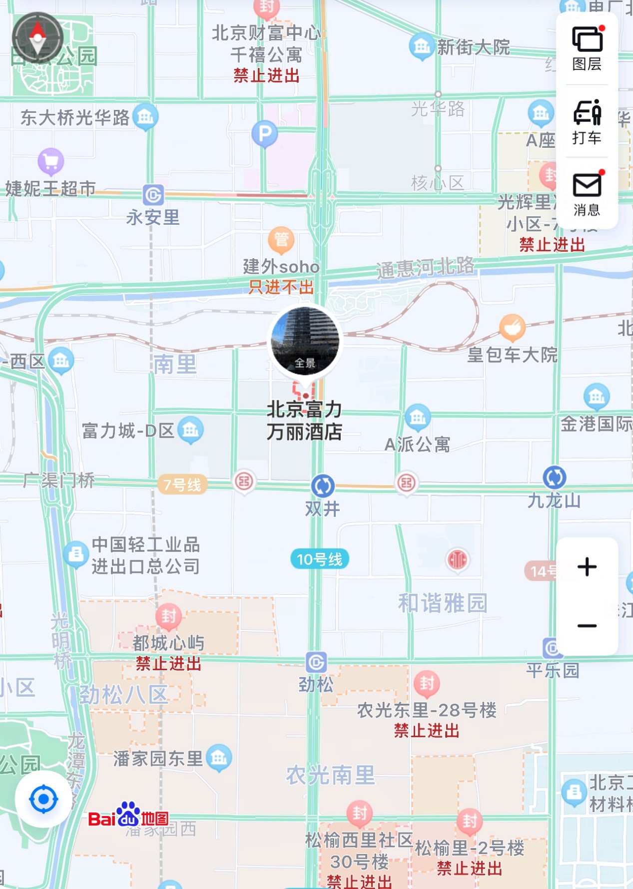 北京富力萬麗酒店臨近朝陽區(qū)疫情管控區(qū)(來源:百度地圖)