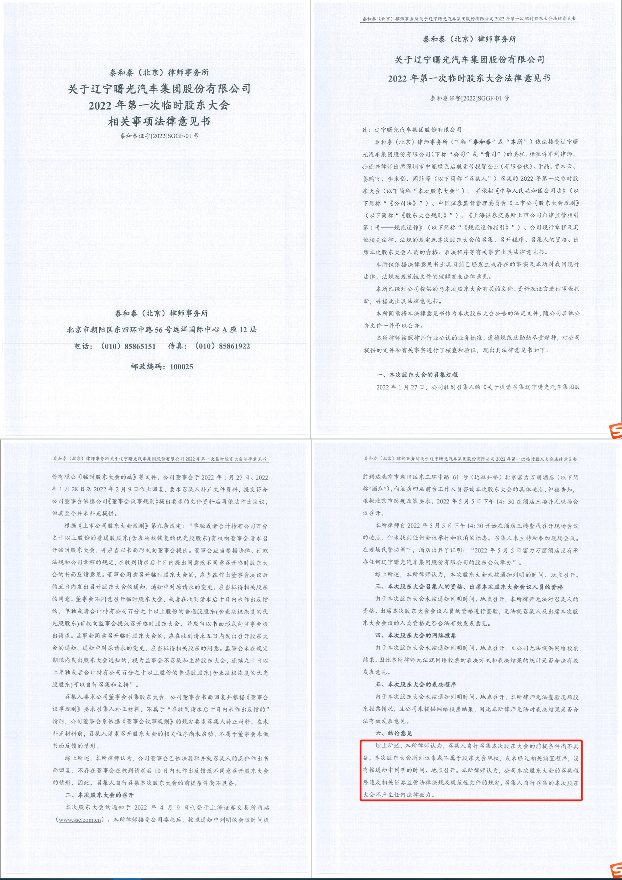 5月5日晚,針對此次臨時股東大會,ST曙光披露了泰和泰(北京)律師事務(wù)所出具的法律意見,法律意見認為召集人自行召集本次股東大會的前提條件尚不具備。由于本次股東大會未按通知中列明的時間、地點召開。本次股東大會所列議案或不屬于股東大會職權(quán),或未經(jīng)過相關(guān)前置程序,沒有按通知要求設(shè)置會場。律師所律師認為本次股東大會的召集程序違反相關(guān)證券監(jiān)管法律法規(guī)及規(guī)范性文件的規(guī)定,沒有舉行現(xiàn)場會議。該次股東大會沒有實際召開,不產(chǎn)生任何法律效力。