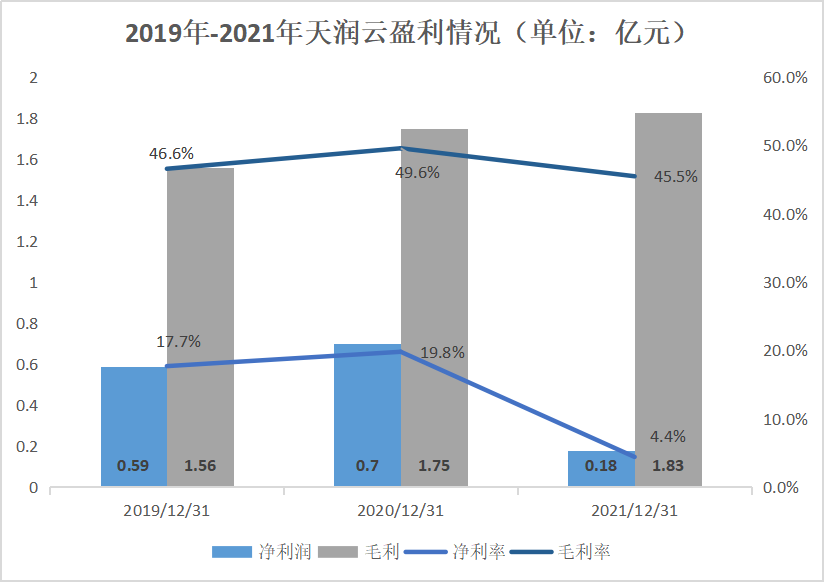 盈利方面,2019年、2020年和2021年,天潤云分別實現(xiàn)毛利為1.56億元、1.75億元、1.83億元,凈利潤為5914.5萬元、7016.7萬元和1781.8萬元。其中,2021年凈利潤下滑74.6%,毛利率分別為46.6%、49.6%和45.5%。
