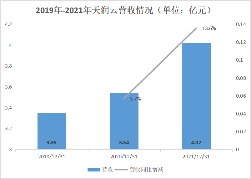 招股書顯示,2019年、2020年和2021年,天潤云的收入分別為3.35億元、3.54億元和4.02億元。