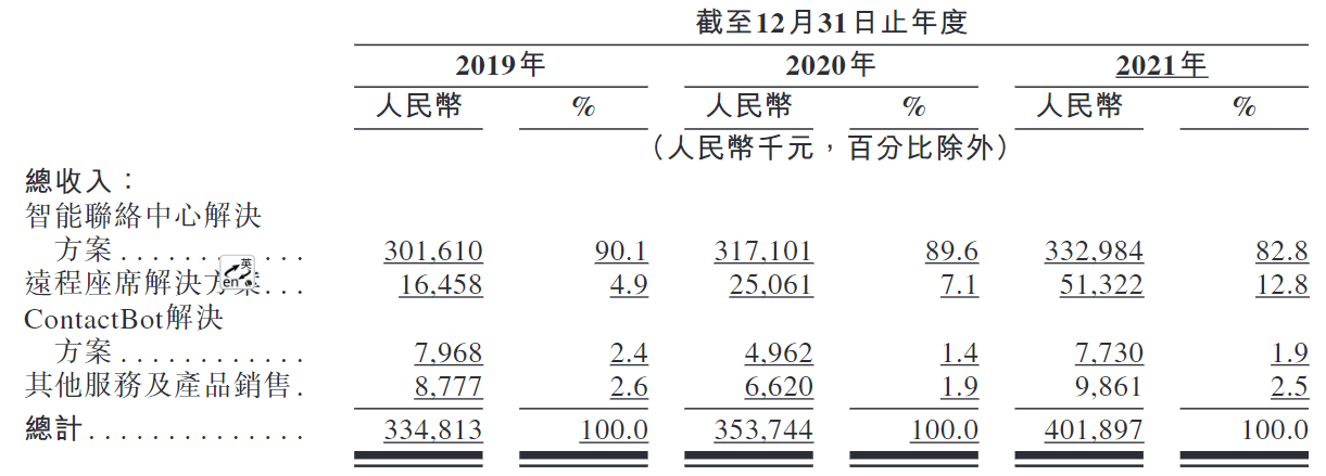 其中,智能聯(lián)絡(luò)中心解決方案是公司的主營業(yè)務(wù),占總營收比例超八成。2021年,其智能聯(lián)絡(luò)中心解決方案實現(xiàn)收入3.33億元,占總營收比重為82.8%,遠(yuǎn)程座席解決方案實現(xiàn)收入5132.2萬元,占總營收比重12.8%,ContactBot解決方案實現(xiàn)營收773萬元,占總營收比重為1.9%,另有其他服務(wù)及產(chǎn)品銷售占比2.5%。