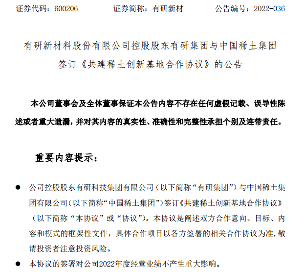7月20日,有研新材料股份有限公司(下稱“有研新材”)發(fā)布公告稱,其公司控股股東有研科技集團(tuán)有限公司(以下簡(jiǎn)稱“有研集團(tuán)”)與中國(guó)稀土集團(tuán)有限公司(以下簡(jiǎn)稱“中國(guó)稀土集團(tuán)”)于7月19日在北京簽訂《共建稀土創(chuàng)新基地合作協(xié)議》,旨在充分發(fā)揮雙方各自特色優(yōu)勢(shì),共同促進(jìn)稀土產(chǎn)業(yè)綠色可持續(xù)發(fā)展。