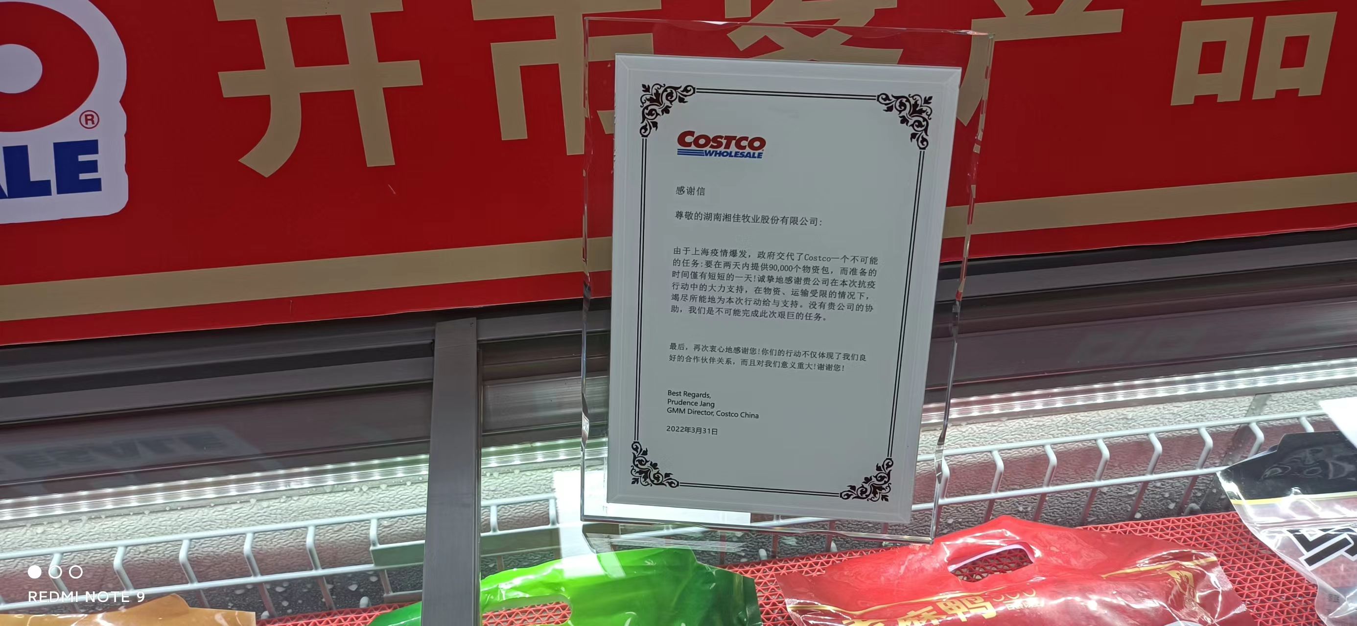 常德缽子菜是湘菜中的經(jīng)典菜肴,其中石門土雞•烤雞、石門肥腸、茶油蒸雞、洞庭谷鴨、石門土雞雞公煲、醬香黑豬蹄、湘西黑豬肉、石門土家臘肉等為石門名品,有滋味厚重、冬春進(jìn)補(bǔ)等特點(diǎn),也是湘佳股份較早實(shí)現(xiàn)的預(yù)制菜產(chǎn)品。在產(chǎn)品陳列室里,記者看到眾多的產(chǎn)品琳瑯滿目,而在2022年3月上海防疫中,由美國(guó)最大的連鎖會(huì)員制倉(cāng)儲(chǔ)量販店COSTCO發(fā)來(lái)的感謝信則立在柜臺(tái)的一角。