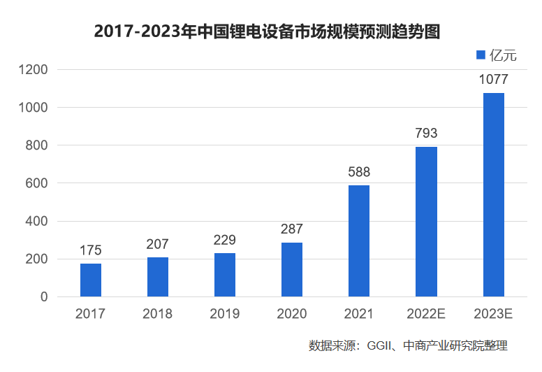近年,全球動力電池需求量大幅增加,未來幾年動力電池仍將持續(xù)緊缺,電池產(chǎn)能擴產(chǎn)將持續(xù)拉動鋰電池裝備行業(yè)。據(jù)GGII預(yù)計,2025年全球動力電池出貨量將達到1550GWh,2030年有望達到3000GWh。而2021年中國鋰電設(shè)備市場規(guī)模為588億元,2017年至2021年市場規(guī)模年均復(fù)合增長率為27.4%,預(yù)計2023年中國鋰電設(shè)備市場規(guī)模將達1077億元。