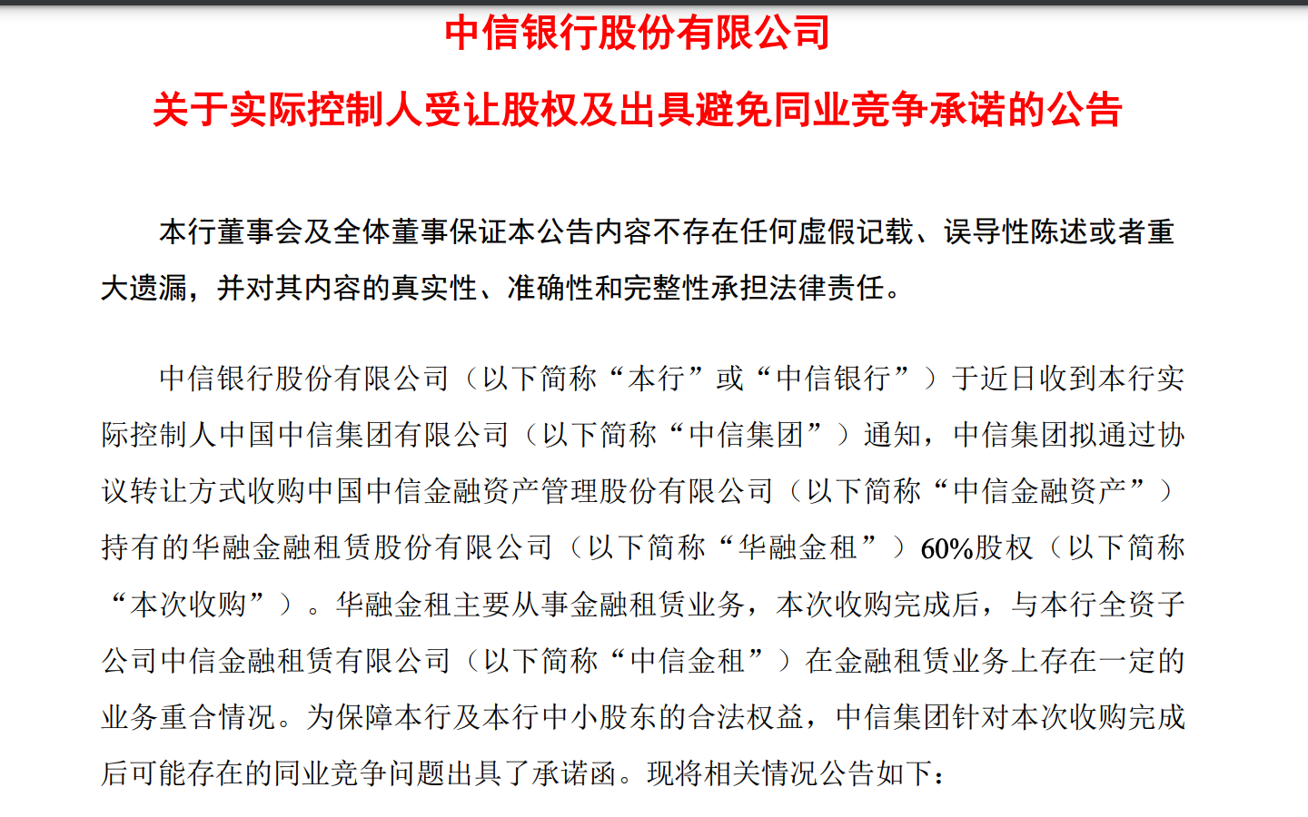 與此同時,中信銀行發(fā)布《關(guān)于實際控制人受讓股權(quán)及出具避免同業(yè)競爭承諾的公告》,此次收購?fù)瓿珊?,與該行全資子公司中信金融租賃有限公司(簡稱“中信金租”)在金融租賃業(yè)務(wù)上存在一定的業(yè)務(wù)重合情況。為保障該行及該行中小股東的合法權(quán)益,中信集團(tuán)針對本次收購?fù)瓿珊罂赡艽嬖诘耐瑯I(yè)競爭問題出具了承諾函。