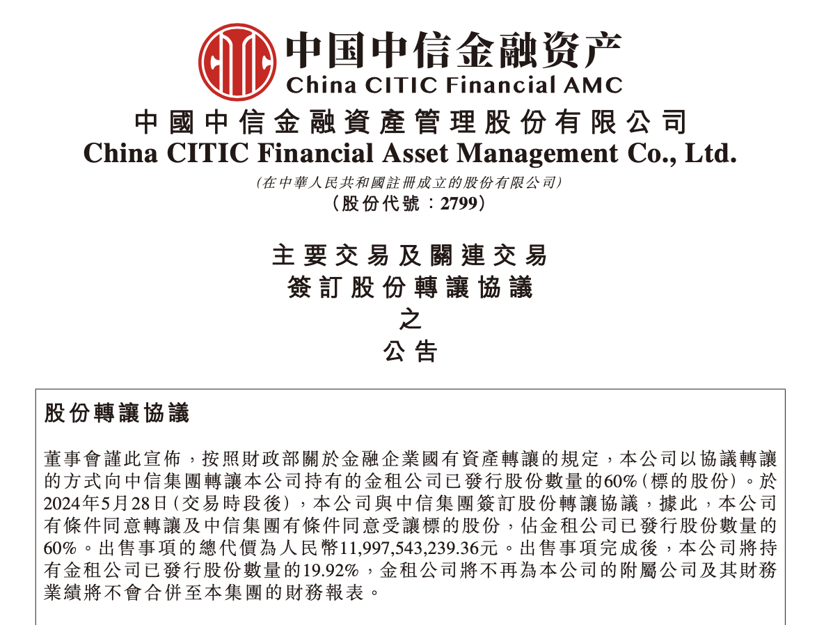 5月28日,中信金融資產(chǎn)發(fā)布公告稱,按照財政部關(guān)于金融企業(yè)國有資產(chǎn)轉(zhuǎn)讓的規(guī)定,以協(xié)議轉(zhuǎn)讓的方式向中信集團(tuán)轉(zhuǎn)讓該公司持有的金租公司(華融金租)已發(fā)行股份數(shù)量的60%(標(biāo)的股份),出售事項的總代價為人民幣119.98億元。出售事項完成后,中信金融資產(chǎn)將持有金租公司已發(fā)行股份數(shù)量的19.92%,金租公司將不再為中信金融資產(chǎn)的附屬公司。
