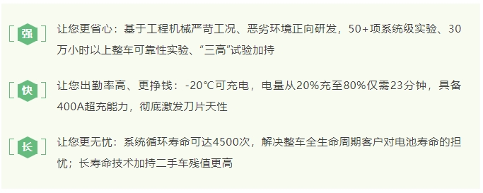 活動現(xiàn)場,濰柴重磅發(fā)布全系列工程機械新能源動力電池產品,覆蓋裝載機、挖掘機、礦卡等市場,具有超級安全、超長壽命、超高強度、超級快充等性能優(yōu)勢,為客戶提供多元、低碳、高效的新能源動力解決方案,引領行業(yè)新變革。