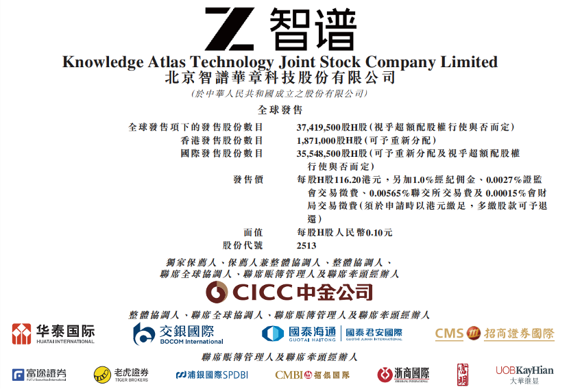 12月30日,北京智譜華章科技股份有限公司(以下簡稱“智譜華章”)正式開啟港股招股,至2026年1月5日結(jié)束,并計劃于2026年1月8日正式以“2513”為股票代碼在港交所主板掛牌上市。公司擬全球發(fā)售3741.95萬股H股,其中香港公開發(fā)售187.1萬股H股,國際發(fā)售3554.85萬股H股。