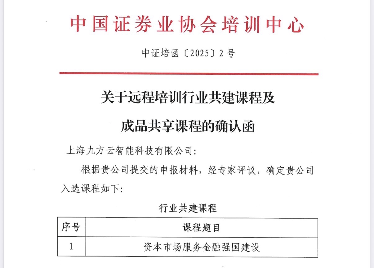 在金融強國戰(zhàn)略加速推進的背景下,高質(zhì)量金融人才的培養(yǎng)已成為支撐資本市場健康發(fā)展的核心要素。此前,中國證券業(yè)協(xié)會培訓中心下發(fā)《關(guān)于遠程培訓行業(yè)共建課程及成品共享課程的確認函》,九方智投控股有限公司(以下簡稱“九方智投”)報送的課程《資本市場服務(wù)金融強國建設(shè)》成功入選“行業(yè)共建課程”。