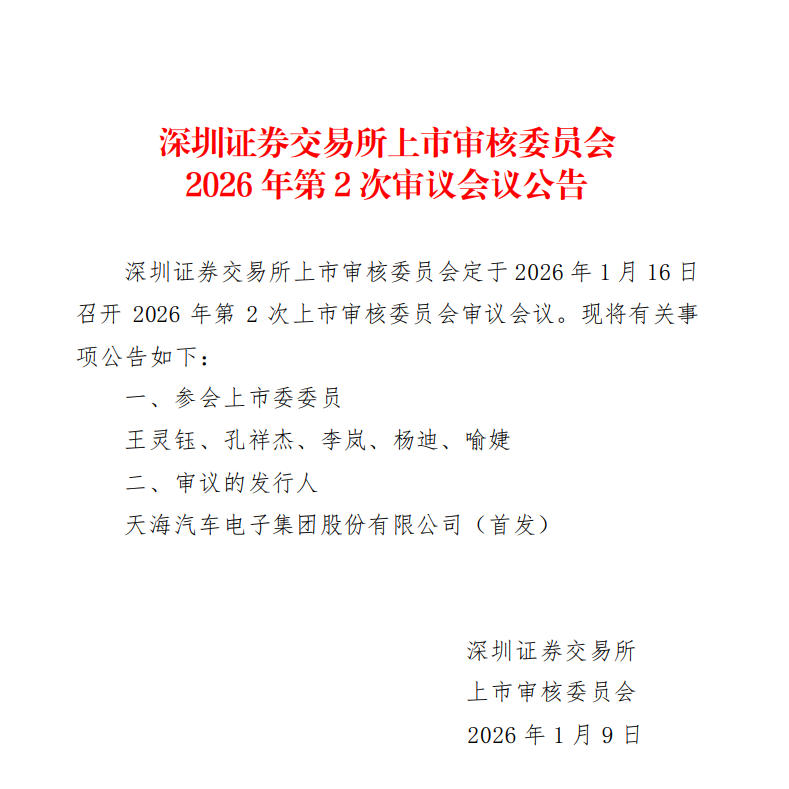 本報訊 (記者肖艷青)1月9日,深交所官網(wǎng)顯示,深交所上市審核委員會將于1月16日召開2026年第2次上市審核委員會審議會議,審議天海汽車電子集團股份有限公司(以下簡稱“天海電子”)深交所主板首發(fā)事項。