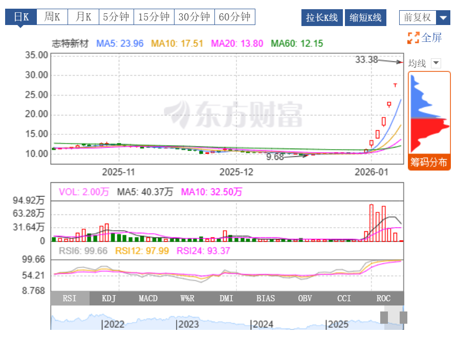 1月12日晚間,江西志特新材料股份有限公司(以下簡(jiǎn)稱“志特新材”,300986.SZ)發(fā)布公告稱,公司股票自2026年1月5日至1月12日連續(xù)6個(gè)交易日漲停,漲幅為198.57%,股價(jià)波動(dòng)較大。為維護(hù)投資者利益,公司將就股票交易波動(dòng)情況進(jìn)行核查。經(jīng)申請(qǐng),公司股票自1月13日開(kāi)市起停牌,預(yù)計(jì)停牌時(shí)間不超過(guò)3個(gè)交易日。公司提醒投資者注意二級(jí)市場(chǎng)交易風(fēng)險(xiǎn)。