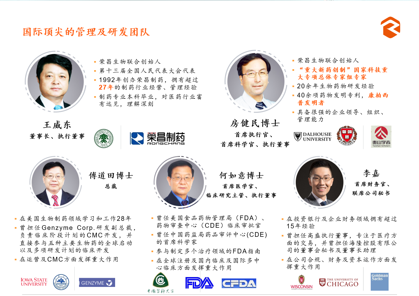 榮昌生物領(lǐng)先全球的研發(fā)管線背后,站著一個(gè)超級(jí)耀眼的明星團(tuán)隊(duì)。除榮昌生物聯(lián)合創(chuàng)始人、CEO兼CSO房健民博士外,公司其他高管在諸如創(chuàng)新藥物研發(fā)、臨床開(kāi)發(fā)、商業(yè)化等方面也都擁有成功經(jīng)驗(yàn)。榮昌生物聯(lián)合創(chuàng)始人、董事長(zhǎng)王威東,擁有超過(guò)30年的制藥行業(yè)經(jīng)營(yíng)、管理經(jīng)驗(yàn),于1993年創(chuàng)立煙臺(tái)榮昌制藥股份有限公司,這是一家從事傳統(tǒng)中藥開(kāi)發(fā)、生產(chǎn)及銷(xiāo)售的中國(guó)制藥公司,旗下?lián)碛懈靥┑戎放?。公司首席醫(yī)學(xué)官何如意博士是中國(guó)藥品臨床研發(fā)及全球監(jiān)管制度領(lǐng)域的權(quán)威專(zhuān)家,曾在美國(guó)FDA任職17年,之后被中國(guó)藥監(jiān)局以首席科學(xué)家身份特邀回國(guó),熟知中國(guó)、美國(guó)及其他國(guó)家和地區(qū)的監(jiān)管審查規(guī)定及審批程序,在擔(dān)任國(guó)家藥監(jiān)局藥品審評(píng)中心首席科學(xué)家期間推動(dòng)了中國(guó)多項(xiàng)重要的藥政改革。公司總裁傅道田博士在國(guó)際生物藥研發(fā)、項(xiàng)目與人員管理,包括生產(chǎn)工藝設(shè)計(jì)和研發(fā),分析平臺(tái)建立,質(zhì)量標(biāo)準(zhǔn)認(rèn)定和國(guó)際申報(bào)上擁有20多年的豐富經(jīng)驗(yàn),曾任麗珠醫(yī)藥副總裁及執(zhí)行董事,擔(dān)任過(guò)美國(guó)著名生物醫(yī)藥公司健贊研發(fā)副總裁,直接參與過(guò)5種主要生物藥的全球上市以及多項(xiàng)開(kāi)發(fā)項(xiàng)目的臨床開(kāi)發(fā)。