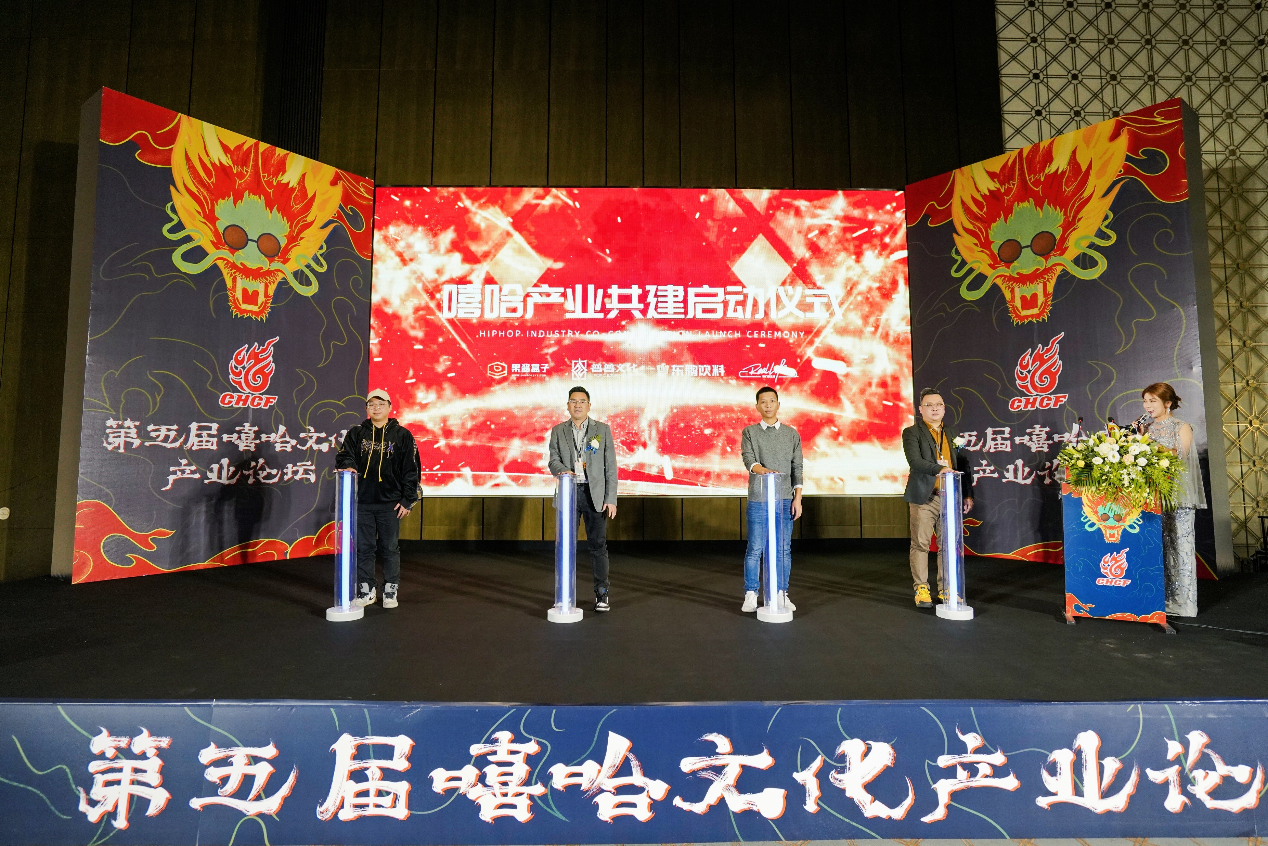 會上,果醬盒子創(chuàng)始人易海南、普普文化副總裁林偉毅、東鵬飲料媒介經(jīng)理黃翀、粵港澳大灣區(qū)街舞潮流文化中心主任鄭鋒參與了嘻哈產(chǎn)業(yè)共建單位的啟動儀式。