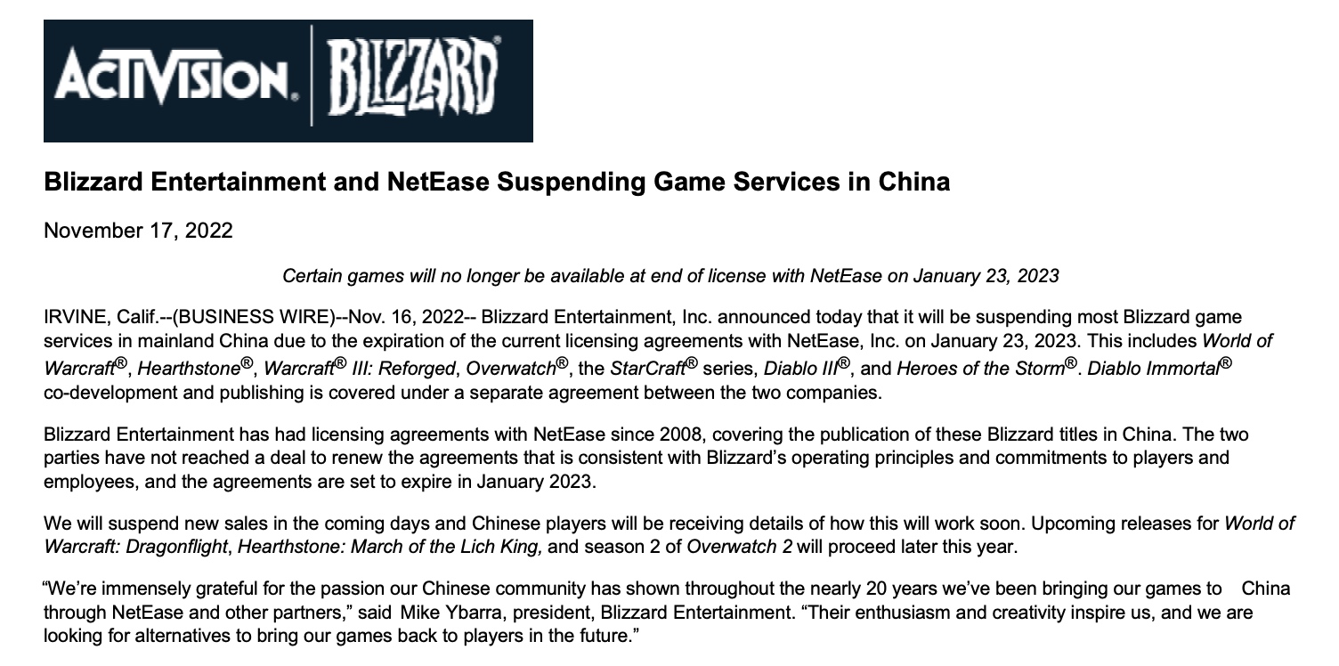 11月17日,動視暴雪(簡稱暴雪)投資者官網(wǎng)發(fā)布消息稱,由于與網(wǎng)易公司的現(xiàn)行許可協(xié)議將于2023年1月23日到期,將暫停在中國大部分暴雪游戲服務(wù)。包括魔獸世界、爐石傳說、魔獸爭霸III:重制版、守望先鋒、星際爭霸系列、暗黑破壞神III和風(fēng)暴英雄。