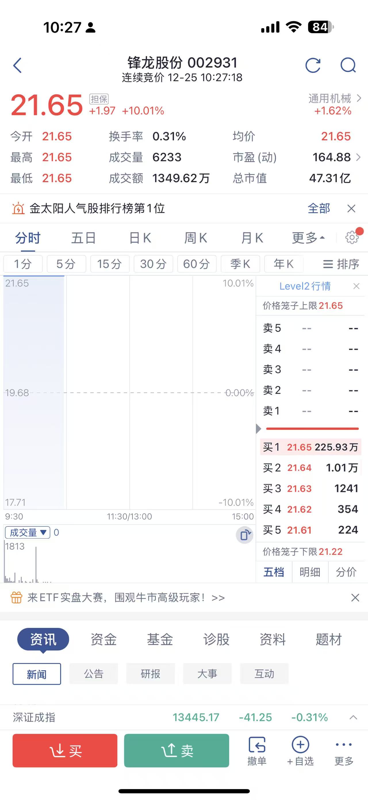 12月25日,鋒龍股份復牌后一字漲停,報21.65元/股。截至記者發(fā)稿,漲停板封單量超200萬手。
