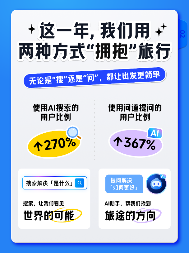 報(bào)告數(shù)據(jù)顯示,2025年,在搜索中使用AI規(guī)劃旅行的用戶比例同比提升270%,而深度使用AI問答產(chǎn)品“問道”的用戶規(guī)模更是同比增長367%。旅行已從單純的信息查詢,演進(jìn)為情緒調(diào)節(jié)與生活延伸的重要方式。搜索框負(fù)責(zé)解決“是什么”,AI對話框開始回應(yīng)“如何更好”。