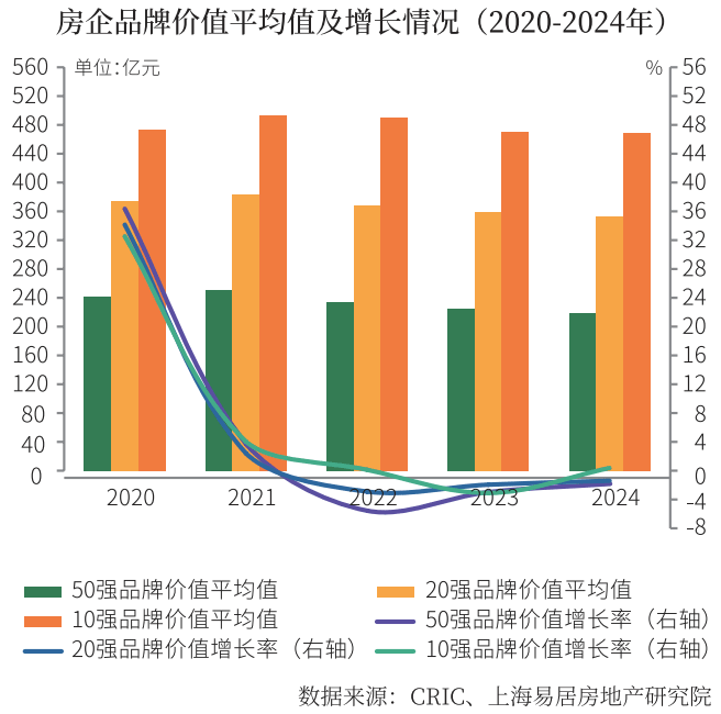 從2020-2024年房地產(chǎn)企業(yè)品牌價值測評結(jié)果看,企業(yè)品牌價值總體繼續(xù)下降,但降幅收窄。具體來看,2024年50強(qiáng)品牌價值均值由上年的225億元回落至219億元,同比下降2.51%,20強(qiáng)的品牌價值均值由上年的360億元回落至353億元,同比下降1.95%,10強(qiáng)的品牌價值均值由上年的470億元回落至469億元,同比下降0.17%。