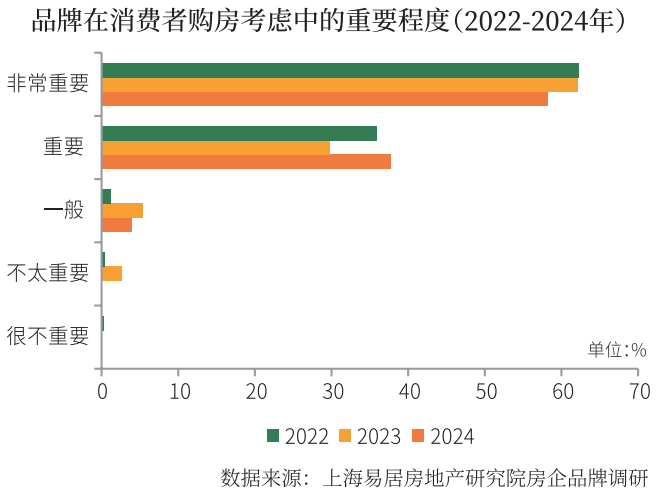 2024年消費(fèi)端調(diào)研結(jié)果顯示,品牌在消費(fèi)者購房行為中起著重大的影響。2024年,在消費(fèi)者對房企品牌重視程度方面,選擇非常重要的占比達(dá)58.28%,選擇重要的占比為37.70%,兩者之和較上年提升4.09個百分點(diǎn),選擇一般的占比4.02%,較上年下降1.39個百分點(diǎn),不太重要、很不重要的占比均為0。