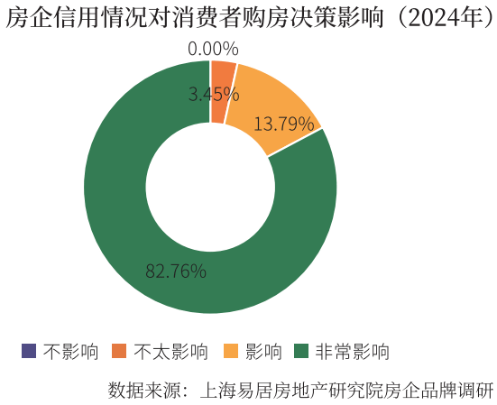 從2024年的消費(fèi)者調(diào)研來看,房企的信用情況依舊受到消費(fèi)者重點(diǎn)關(guān)注。在被問及如果開發(fā)商有債務(wù)違約等信用及財務(wù)風(fēng)險情況,是否會影響購房決策時,全部消費(fèi)者認(rèn)為開發(fā)商的信用及財務(wù)風(fēng)險會影響其購房決策。其中,82.76%的消費(fèi)者認(rèn)為非常影響,此比例較上年上升20.60個百分點(diǎn)。不太影響的占比為3.45%,較上年下降4.66個百分點(diǎn)。2024年房地產(chǎn)市場繼續(xù)處在低位調(diào)整,置業(yè)者對市場的預(yù)期走低,置業(yè)信心不足觀望情緒濃厚,對房企的信用敏感度遠(yuǎn)勝以往。