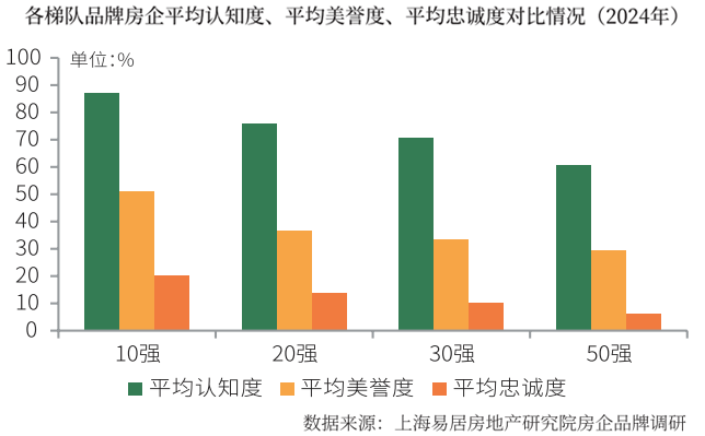 連續(xù)五年通過消費(fèi)者調(diào)研,從認(rèn)知度、美譽(yù)度和忠誠度三個維度分析房企的品牌特征。2024年50強(qiáng)品牌房企的平均認(rèn)知度、美譽(yù)度和忠誠度均有所下降。調(diào)研結(jié)果顯示,2024年50強(qiáng)品牌房企平均認(rèn)知度為60.62%,較上年減少4.75個百分點(diǎn)。平均美譽(yù)度為29.61%,較上年減少0.06個百分點(diǎn);平均忠誠度繼續(xù)下降,僅為6.37%。