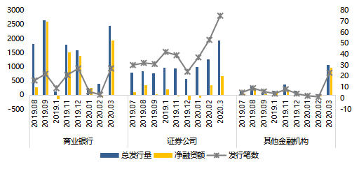 東方金誠(chéng)發(fā)布的金融債市場(chǎng)月報(bào)顯示,2020年3月份金融機(jī)構(gòu)共計(jì)發(fā)行金融債125只,發(fā)行規(guī)模合計(jì)5494.80億元,環(huán)比及同比分別增長(zhǎng)228.15%和44.64%,創(chuàng)歷史新高。