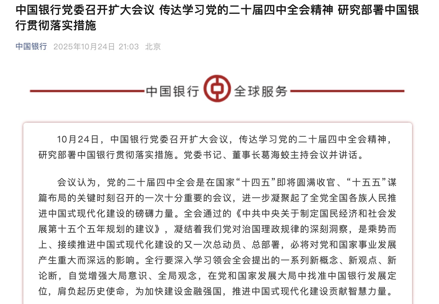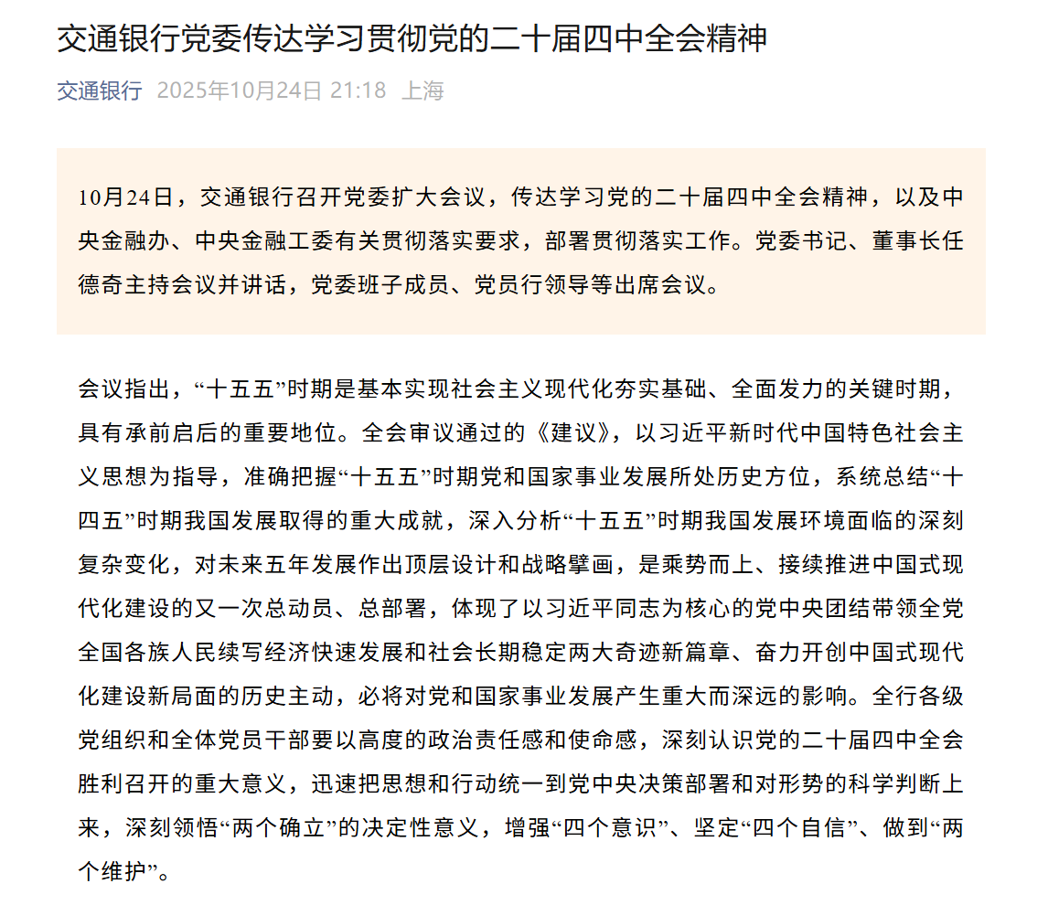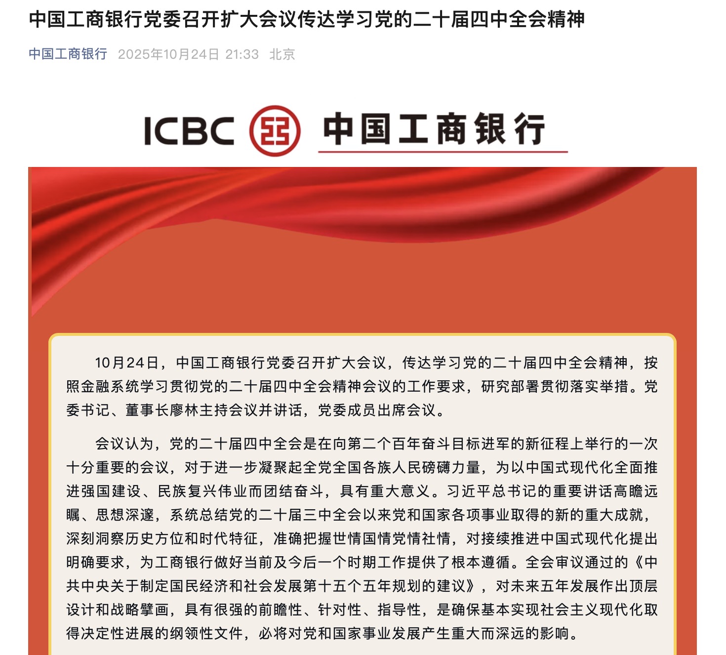 10月24日,工商銀行、農(nóng)業(yè)銀行、中國銀行、建設(shè)銀行、交通銀行、郵儲銀行黨委紛紛召開會議傳達(dá)學(xué)習(xí)黨的二十屆四中全會精神,按照金融系統(tǒng)學(xué)習(xí)貫徹黨的二十屆四中全會精神會議的工作要求,研究部署貫徹落實舉措。
