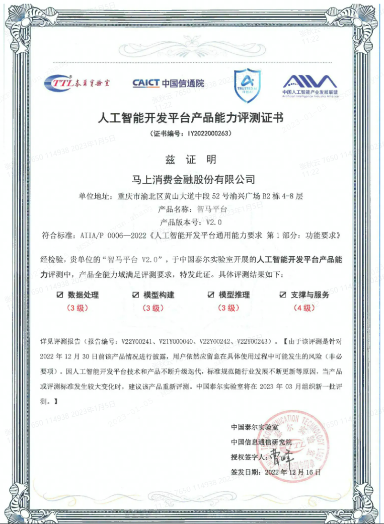 據(jù)悉,該評(píng)測(cè)主要依據(jù)《人工智能開(kāi)發(fā)平臺(tái)通用能力要求-第1部分:功能要求(AIIA/P0006—2022)》,面向產(chǎn)品提供方和應(yīng)用使用方,聚焦全棧全流程AI開(kāi)發(fā)所需功能,對(duì)AI開(kāi)發(fā)過(guò)程中所需的167項(xiàng)基本功能和63項(xiàng)高級(jí)功能進(jìn)行評(píng)測(cè)。馬上消費(fèi)智馬平臺(tái)的數(shù)據(jù)處理、模型構(gòu)建、模型推理、支撐與服務(wù)通過(guò)評(píng)測(cè),成為國(guó)內(nèi)唯一一家通過(guò)全能力域評(píng)測(cè)的消費(fèi)金融機(jī)構(gòu)。