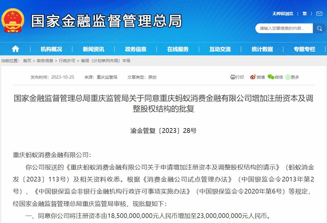 10月25日,根據(jù)國家金融監(jiān)督管理總局官網(wǎng),經(jīng)國家金融監(jiān)督管理總局重慶監(jiān)管局審核批復(fù),同意重慶螞蟻消費金融有限公司(下稱:螞蟻消金)將注冊資本由185億元人民幣增加至230億元人民幣。此次增加注冊資本并調(diào)整股權(quán)結(jié)構(gòu)后,螞蟻消金股東達13家。